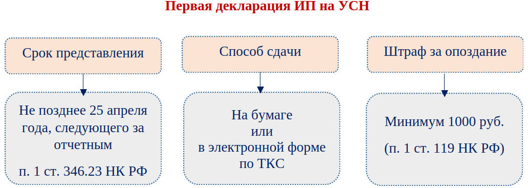 Предприниматели-упрощенцы, начавшие свою деятельность в последний месяц календарного года (например, в декабре 2022 года), обязаны представить в налоговую инспекцию декларацию по УСН за 2022 год. При этом не имеет значения, сколько дней в декабре отчетного года упрощенец работал, осуществлял ли фактически предпринимательскую деятельность, получал ли доходы. Остаток текущего года – от момента госрегистрации в ЕГРИП до конца года – является для ИП на УСН первым налоговым периодом.