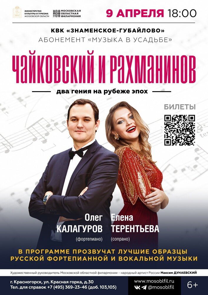 В усадьбе «Знаменское-Губайлово» в Красногорске 9 апреля пройдет концерт абонемента «Музыка в усадьбе» «Чайковский и Рахманинов. Два гения на рубеже эпох». В усадьбе отмечают, что в этом году совпали два юбилея: 150 лет со дня рождения Сергея Рахманинова и 130 лет со дня смерти Петра Чайковского. Композиторы были знакомы друг с другом. Рахманинов тогда учился в Московской консерватории, а Петр Ильич оценивал его навыки на экзамене по гармонии – поставил «пять с плюсом» и еще три «плюса» вокруг цифры. Чайковский считал, что из Рахманинова получится прекрасный композитор. На концерте в усадьбе исполнят вокальные и инструментальные произведения композиторов. Перед гостями выступят солистка Московского театра «Новая Опера», заслуженная артистка Башкортостана Елена Терентьева (сопрано) и солист Московской областной филармонии, лауреат международных конкурсов Олег Калагуров (фортепиано). Начало в 18:00.