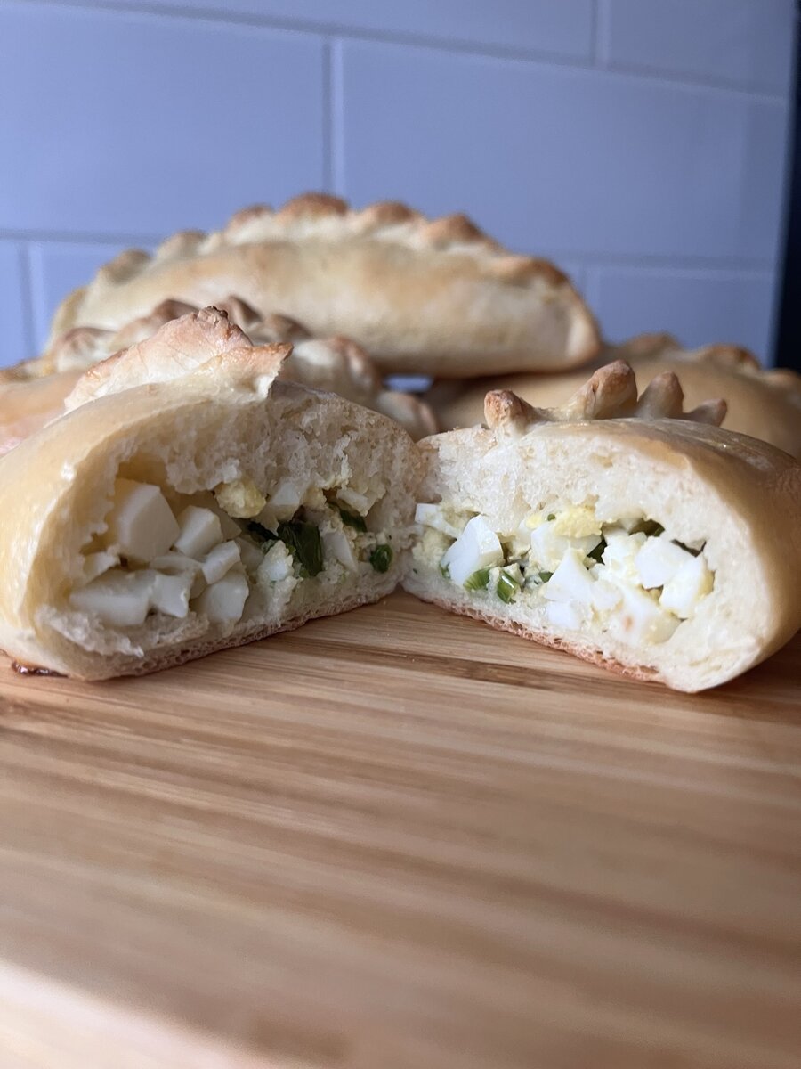 Как я уже написала ранее, шесть штук я сделала с яйцом и луком, шесть – с яблоком. Если вам не хочется возиться с разными начинками, просто удвойте ингредиенты для одной из них.