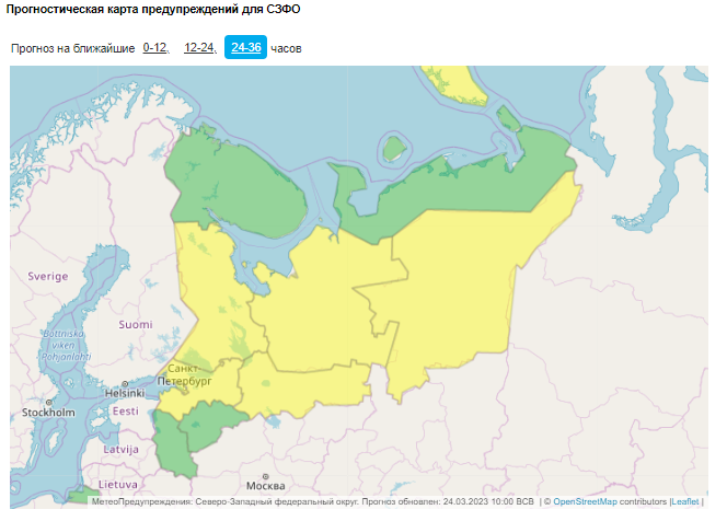 Согласно прогностической карте предупреждений для СЗФО, ветер с порывами до сильно ожидается в период с 10:00 утра и до 18:00 вечера субботы.