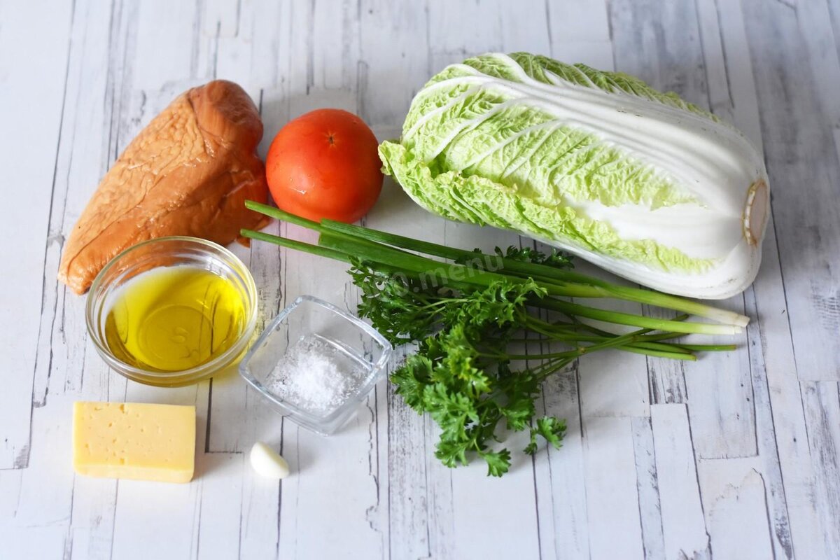 Приготовьте все необходимые ингредиенты. Копченую грудку очистите от кожи и костей и нарежьте соломкой или разберите мясо на волокна. Пекинскую капусту вымойте, обсушите и нашинкуйте соломкой. Помидоры нужно взять плотные и сочные, нарежьте их не большими кусочками. Сыр для салата можно использовать любой какой вам нравиться. Натрите сыр на средней или крупной терке. Зелень вымойте , обсушите и мелко нарежьте. Почистите, и нарежьте мелко чеснок ( можно выдавить через пресс). Соедините все ингредиенты . Салат заправьте растительным маслом , посолите по вкусу и перемешайте. Салат готов. Можете подавать салат прямо в салатнике или выложить в кулинарное кольцо и утрамбовать. Перед подачей на стол снимите кулинарное кольцо и подавайте салат, получается очень красиво. Состав и ингредиенты: