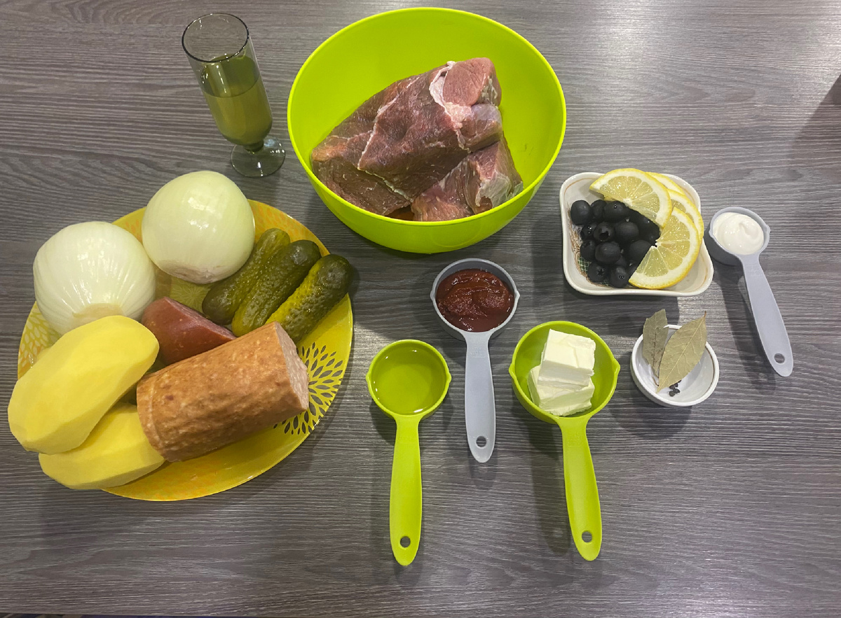 Для солянки нам понадобится: Для подачи: Первым делом ставим вариться на медленном огне мясо и одну луковицу на 2,5 часа. За 20 минут до приготовления, бросаем в кастрюлю перец и лавровый лист, накрываем крышкой и оставляем, чтобы специи отдали свой аромат и вкус. После достаем мясо и лук из кастрюли, а бульон процеживаем через мелкое сито. Нарезаем мясо соломкой и опускаем обратно в кастрюлю. Так же соломкой нарезаем колбасу, картошку режим средним кубиком. Режем огурец на тонкие соломки и выкладываем на сковороду. Заливаем рассолом и припускаем 5-7 минут. После чего высыпаем в кастрюлю. Луковицу нарезаем полукольцами. В сковороде разогреть сливочное масло вместе с растительным, выложить лук, обжарить до мягкости. Добавить томатную пасту и хорошо перемешать. И переложить в кастрюлю. Добавить картошку. Закрыть крышкой на 10 минут. Выкладываем колбасу, солим, перчим и оставляем еще на 15 минут. Суп готов🤤 Наливаем тарелочку вкусного супчика, украшаем лимончиком, оливками и