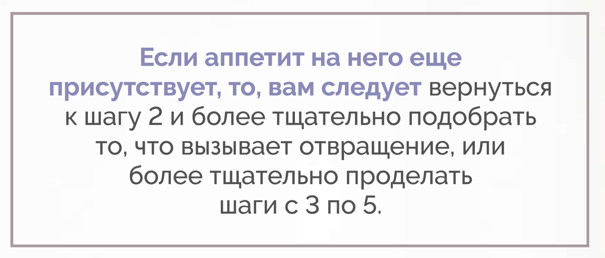 Предлагается три техники для коррекции: «Безразличие», «Уничтожитель», «Отвращение». (не забываем, что каждый человек индивидуален!). Прибегать к этих техникум стоит только в крайних случаях, когда зависимость от определениях продуктов слишком сильна. Техника «Безразличие» 1 шаг. Представьте себя образ-1 продукта, к которому у вас есть зависимость. Поместите образ в рамку. 2 шаг. Создайте мысленно образ-2 с продуктом или веществом, к которому вы испытываете сильное отвращение. Пусть будет что-то такое (внешний вид, запах, вкус), от чего вас стошнило бы. 3 шаг. Закройте глаза. Поместите первую картину (образ-1) совсем близко перед собой, так чтобы продукт стал соблазнительно близко. Поместите вторую картину (образ-2) сразу за первой картинкой, близко к ней. 4 шаг. Сделайте на первой картине, которую продолжаете созерцать, небольшую дырочку в центре, маленькое отверстие, через которое можно видеть фрагмент второй (образ-2) картины. 5 шаг. Быстро распахните отверстие и одновременно