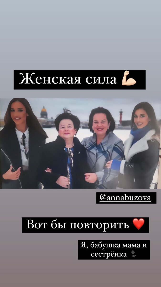 Певица Ольга Бузова предприняла попытку наладить общение со своей младшей сестрой. На своей странице в Instagram (социальная сеть, запрещённая в РФ; принадлежит компании Meta, которая признана в РФ экстремистской и также запрещена) она опубликовала фото с бабушкой, мамой и сестрой и отметила, что хотела бы вновь встретиться. Сегодня, 24 марта, важный день для певицы — день рождения ее мамы. В соцсети артистка опубликовала трогательный пост, в котором поздравила самого близкого человека. Она также опубликовала фотографию со своей мамой, бабушкой и сестрой Анной. Ольга Бузова отметила, что хотела бы повторить это фото и увидеться со всеми. Поклонники предположили, что таким образом певица решила сделать шаг в попытке помириться со своей младшей сестрой. Сестры не общались между собой уже длительное время.