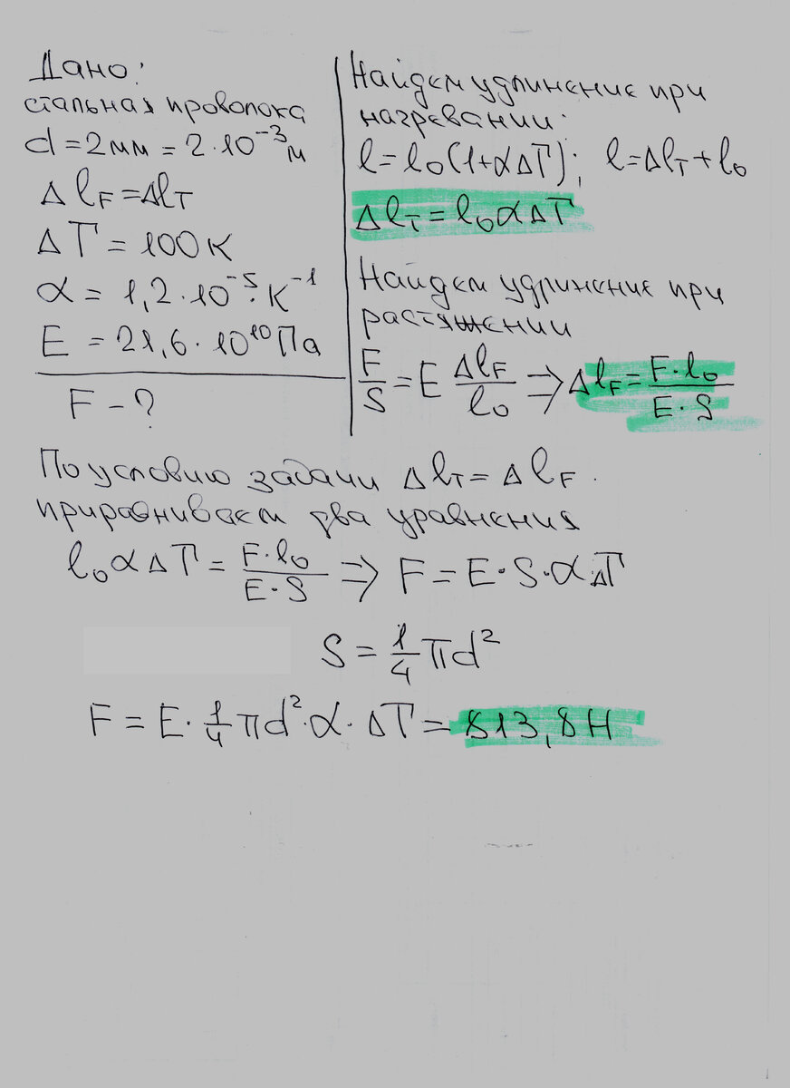 Задача: Какую силу нужно приложить к стальной проволоке диаметром 2мм, что бы получить такое же удлинение, как при нагревании на 100 К? Решение: Для решения задачи в главе 8 находим формулы изменения длины при нагревании и изменение длины под действием силы. Приравниваем получившиеся выражения для температурного и механического удлинения. Находим чему будет равна сила F. Подставляем данные в уравнение. Находим ответ. Заработайте мега-плюс в карму: Если материал был Вам полезен, поставьте пожалуйста лайк и подпишитесь. Это поможет тем кто идёт за Вами находить нужный материал и мотивирует меня на дальнейшую работу. Спасибо! Задача решена. Но ответ не сошёлся с учебником, в учебнике 676 Н. Хотите больше задач? Подписывайтесь на канал, ставьте лайки, пишите комментарии. Предлагайте варианты задач, обязательно со ссылкой на источник.