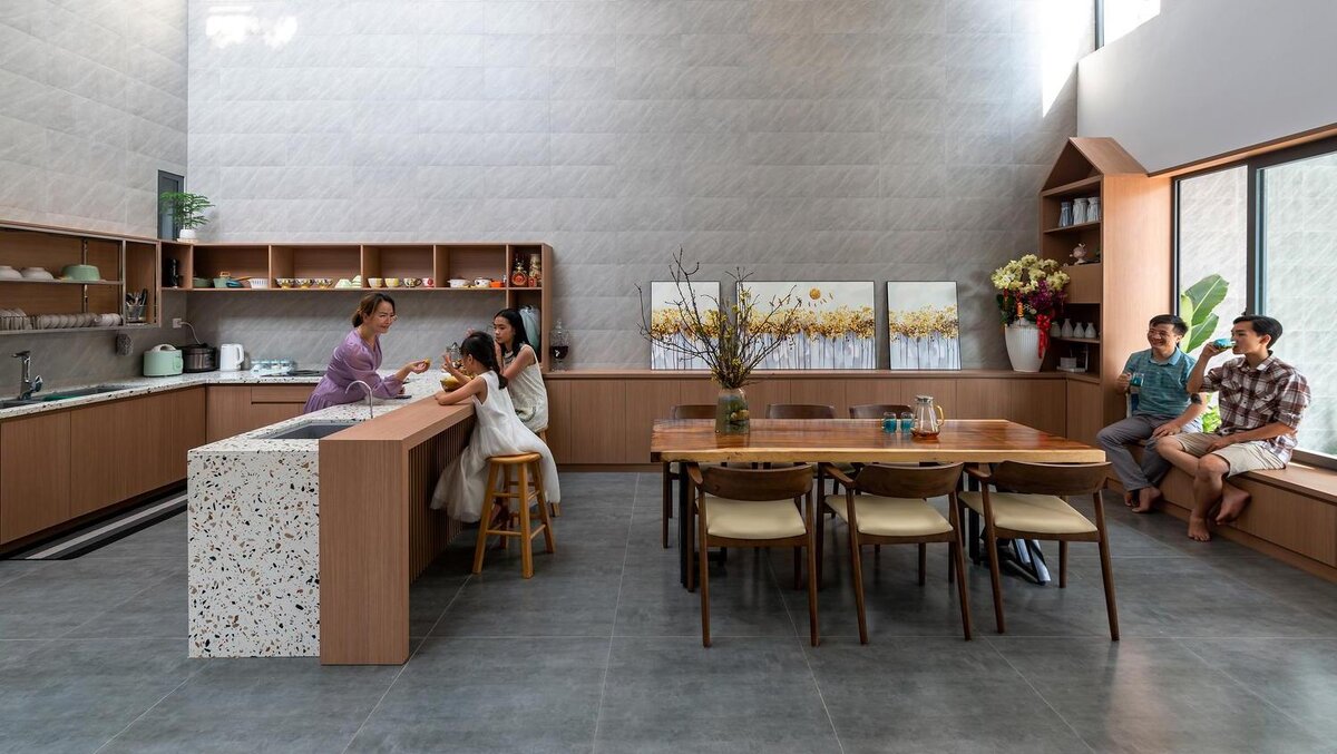 Студия Story Architecture из Хошимина спроектировала гармоничное жилое пространство для семьи из нескольких поколений Небольшой по современным меркам (260 квадратных метров) дом выглядит просторным благодаря стеклянной крыше и большому количеству оконных проемов разной формы, которые впускают внутрь потоки света. На первом этаже, где команда Story Architecture организовала просторную общую зону, естественный свет рассеивает листва деревьев. Белые стены служат своеобразным холстом для колышащихся теней. Главная спальня расположена в дальней части и выходит в небольшой внутренний дворик с садом. На втором этаже расположены детские спальни, двери которых выходят в залитый солнечным светом атриум. Широкая лестница, ведущая на этот уровень, выполняет роль библиотеки и читального зала. Здесь есть небольшой книжный шкаф и зона для чтения со ступеньками, на которых удобно сидеть с книгой. На самом верхнем уровне находится небольшая зона «семейного молитвенного уединения», окно которой выходит