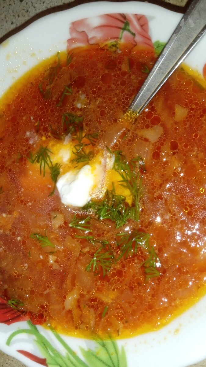 Борщ я всегда готовлю со свёклой. Кто тот не любит свёклу, но так как я люблю, я хочу что бы и мои детки её любили, поэтому мой борщ всегда со свёклой . А вы любите свёклу? А вы добавляете свёклу в борщ? Мне очень интересно почему то это узнать. Ну что ж поехали.☺☺☺ Бульон из косточки свинины, готов. Мясо отложено на тарелочку, отдельно. Овощи лежат и ждут каждый своей очереди. 😊 Режем капусту. Кидаем её самой первой в наш бульон. Варим минут 10 . Добавляем картофель. Пока варится картофель и капуста, делаем красную, вкусную зажарку. Обжариваем слегка лук на подсолнечном масле. К луку добавляем тëртую на мелкой терке морковь. Обжариваем в течение пяти минут. И добавляем тëртую на крупной терке свёклу. Всё хорошо обжариваем помешивая, ну минут 8, не на сильном огне. Добавляем одну столовую ложку томатной пасты. Всё опять хорошо обжариваем, помешивая. И можно добавлять в наш борщ. Капуста у нас свежая, поэтому борщ долго не готовится, всё быстро и вкусно. Мясо с