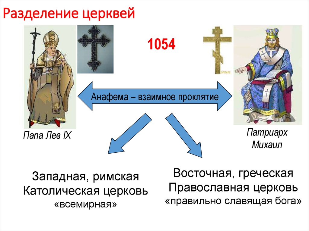 Разногласия начались в 867 году и окончательно оформились в 1054 году, когда три легата Папы Льва IX положили на алтарь собора Святой Софии отлучительную грамоту, предающую анафеме Константинопольского Патриарха Михаила Керулария и двух его ближайших помощников. В ответ Патриарх Михаил предал анафеме Папских легатов.