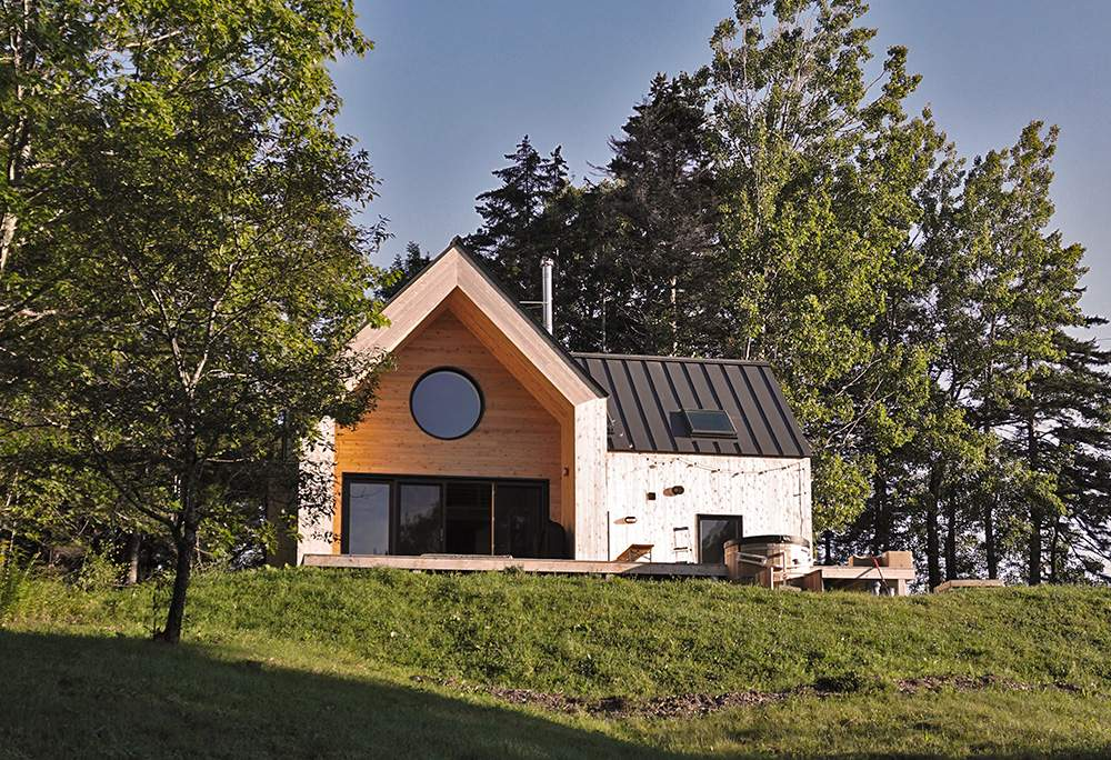 Этот дом принадлежит талантливому фотографу из Бруклина, мечтавшей построить собственное жилище на лоне природы. Главным желанием заказчицы было создать гибкое жилое пространство с большими окнами, где можно будет принимать гостей, готовить и заниматься любимым делом — фотографией Цели на экологичность и здоровую комфортную среду сыграли решающую роль в этом проекте. Дом спроектирован в соответствии с принципами пассивного здания. Панорамные окна, выходящие на южную сторону, защищены широкими карнизными свесами, которые затеняют интерьер летом. При этом зимой солнечные лучи свободно проникают внутрь через остекление и обогревают пространство. Плитный фундамент утеплен пенополистиролом. Для изоляции ограждающих конструкций и кровли использовали фольгированную теплоизоляцию, минеральную вату и пеноизол. Благодаря этому проживать в доме можно круглый год. Оптимальный микроклимат поддерживает система вентиляции с рекуперацией тепла. Фасады коттеджа отделаны необработанным кедром местного п