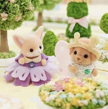 Calico Critters выпустили свою версию тайных пакетиков с малышами в костюмах фруктов и добавили в нее фенеков. В серии вышло два вида пакетиков. В один добавили двух стоящих и одного ползущего малыша: