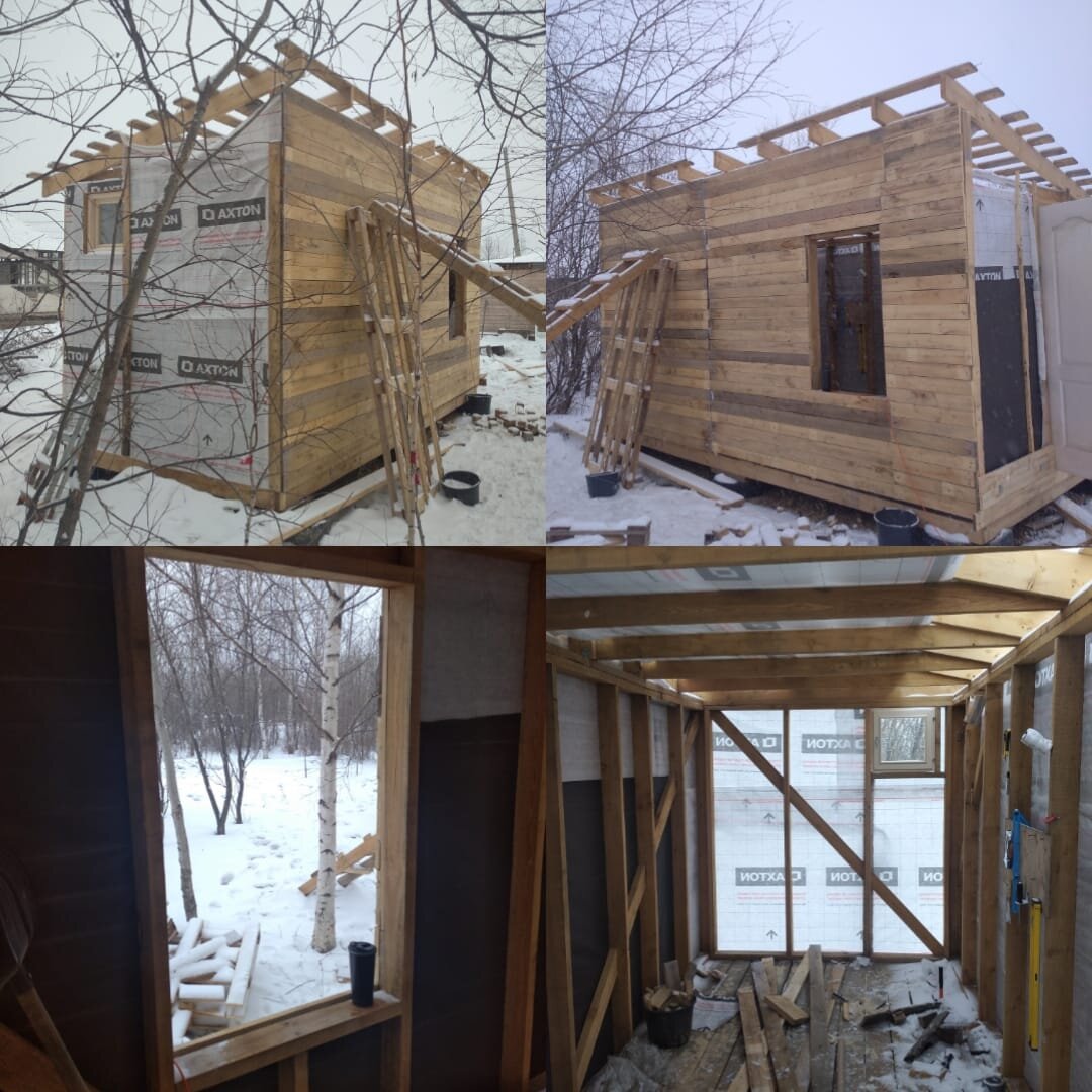 С наступлением тепла продолжил строительство своей мини-бани. Вставил окно в парной (1760 р), дверь (бесплатно), обтянул ветро-влагозащитой (755 р за один рулон, ещё два взял по проекту "семьи леруа мерлен" и подарочному сертификату), снаружи обшил досками от поддонов. Далее надо накрывать крышу, утеплить, делать печь, перегородку, внутреннюю отделку.
