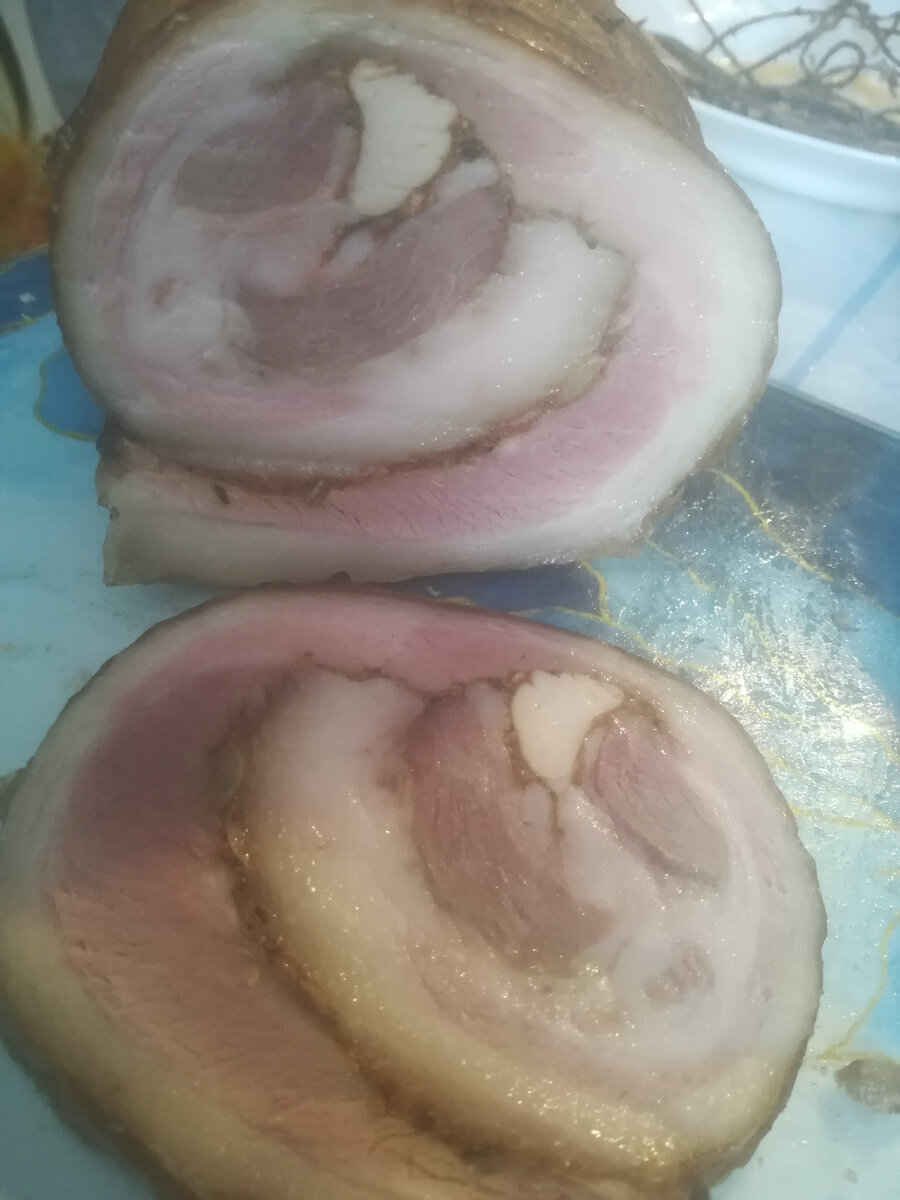 В нашем хозяйстве очередной забой свиньи. И мы снова перерабатываем мясо. Сегодня приготовила вкуснейший рулет из свиной брюшины. Брюшину сначала засолила в расоле на неделю, затем замариновала с чесноком и специями на 2 дня, свернула все в рулет, обвязала шпагатом и варила на медленном огне 2 часа. И вуа-ля вкуснейший рулет готов. Рецепт этот нам достался от наших родителей так готовила и моя мама и моя свекровь. И я когда готовила его рассказала об этом детям. Как в детстве нам мамы готовили такую же вкуснятину. Считаю важно передовать свой опыт своим детям и беречь семейные традиции. Этот рулет прекрасно заходит как на праздничном столе в виде закуски так и на повседневном. Его можно кушать как основное блюдо в прикуску с хлебом и чаем, можно дополнить им завтрак из яиц, а можно кушать в прикуску с борьщем. У нас получилось два больших рулета, каждый мы режем на 4 части и замораживаем, потом при необходимости достаём его из нашего деревенского магазина(морозилка😅) и наслаждаемся в