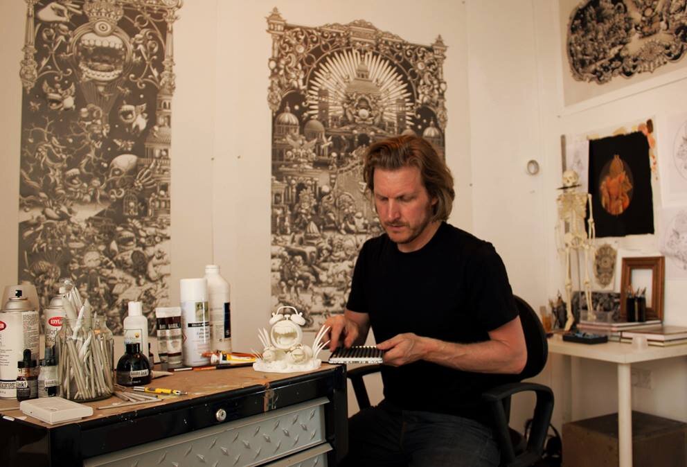 Джо Фентон - лондонский иллюстратор, традиционно использующий чернила и акрил. Его работы отличаются сюрреалистическим и гротескным использованием, их формы и монохромное использование цветов действительно впечатляют оттенками и количеством содержащихся в них элементов.