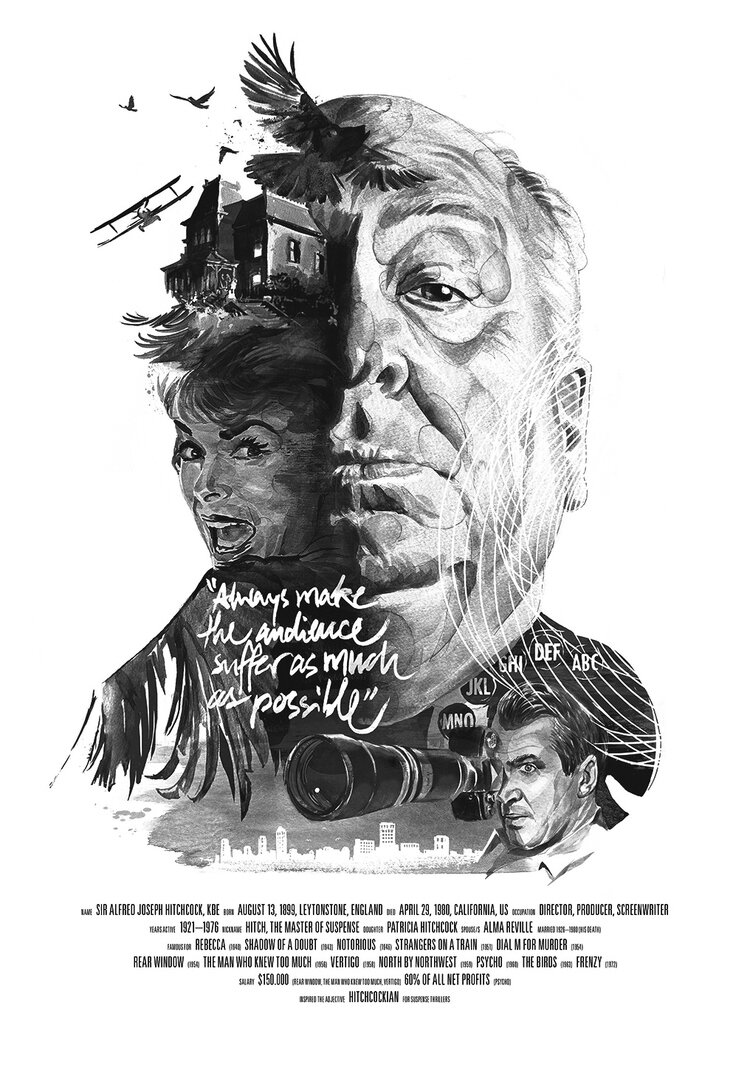 Джулиан Ренцш - иллюстратор немецкого происхождения, создавший несколько фантастических портретов известных режиссеров, таких как Альфред Хичкок, Мартин Скорсезе или Дэвид Линч. Поразительно, с каким мастерством Джулиан сочетает аналоговое и цифровое, а также элегантно использует типографику и великолепную отделку благодаря хлопковой бумаге, которая делает его печатные работы довольно примечательными.