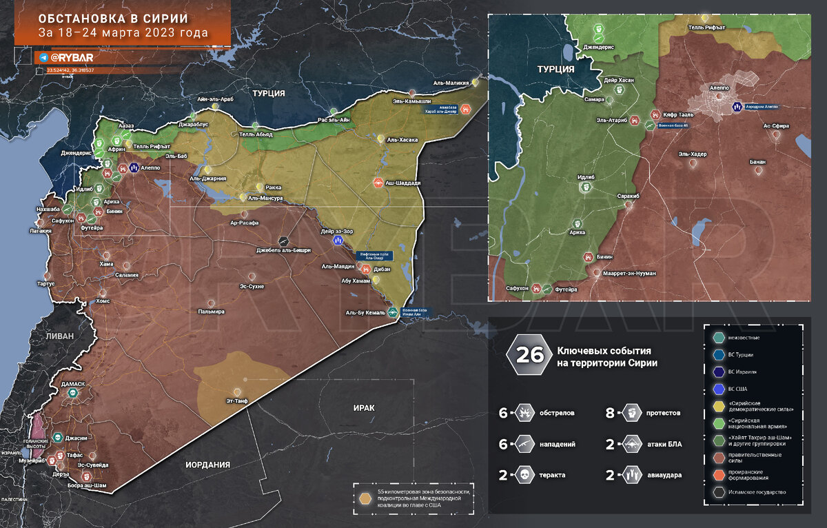 ▪️В ночь с 21 на 22 марта израильские ВВС второй раз за месяц нанесли удары по аэродрому Алеппо. В результате налета объект прекратил работу на несколько дней, во время налета погиб офицер вооруженных сил.