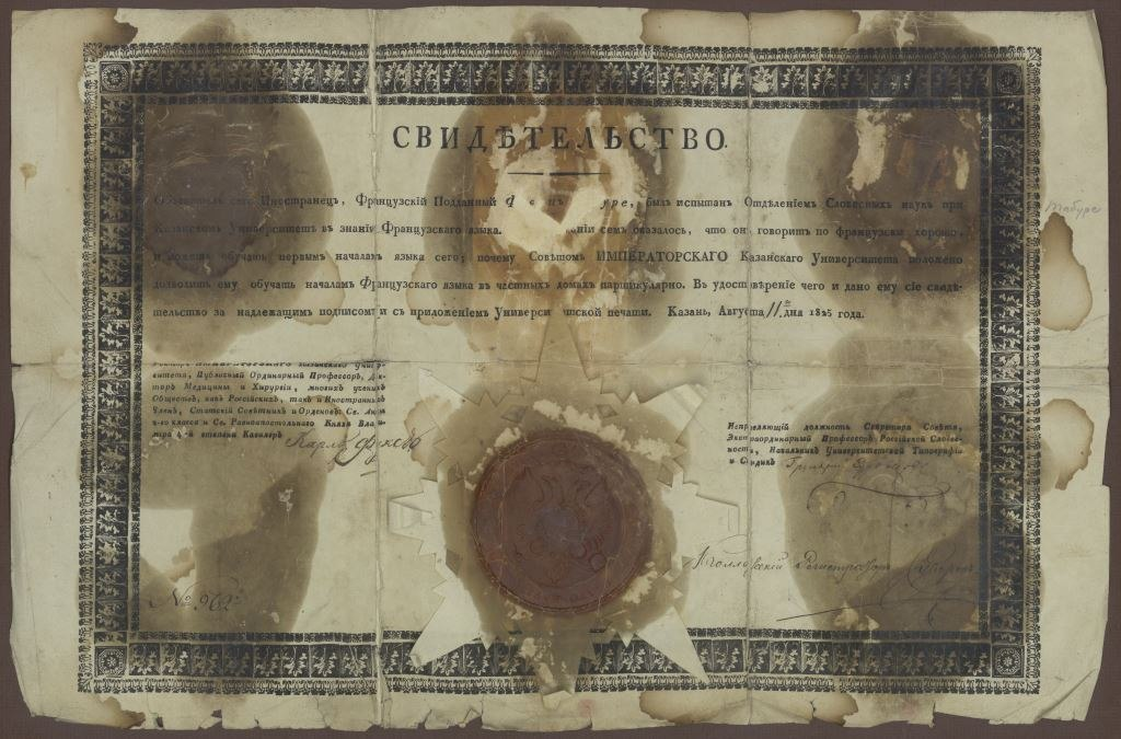 Объявитель сего иностранец, французский подданный Ф[р]а[н]ц [Таб]уре, был испытан Отделением словесных наук при Казанском университете в знании французского языка.[По испытании сем] оказалось, что он говорит по-французски хорошо, и может обучать первым началам языка сего; почему Советом Императорского Казанского университета положено дозволить ему обучать началам французского языка в частных домах партикулярно. В удостоверение чего и дано ему сие свидетельство за надлежащим подписом и с приложением университетской печати. Казань, августа 11го дня 1825 года.