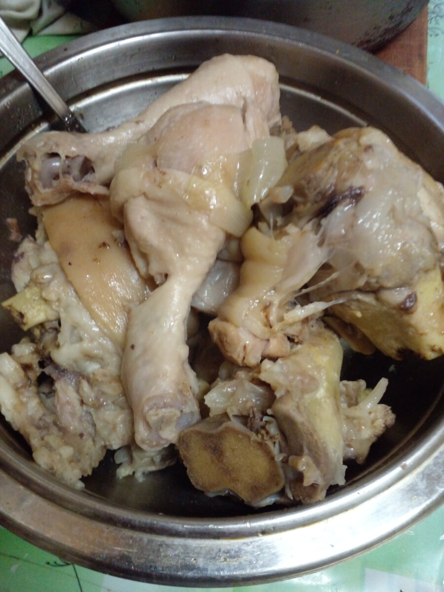Таким стал холодным. Сергей сказал, что похож на тортик. Из мяса только курица. Ножки свиные были очень замечательные и съедены за два дня.