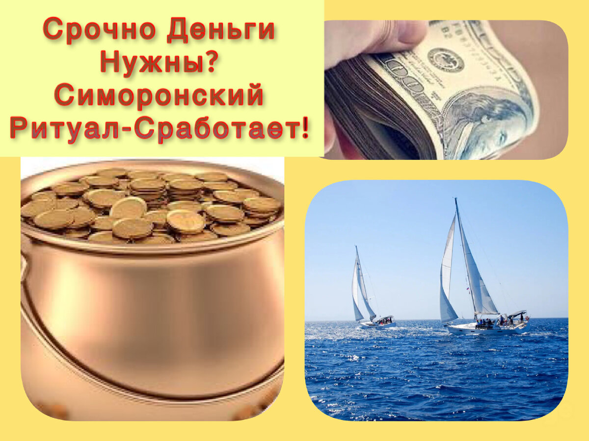 Добро пожаловать ко мне на канал! Я рада именно Вас видеть у себя на страничке! Каждый человек хочет иметь как можно больше денег. Без средств к существованию в принципе невозможно жить, поэтому Вы готовы сделать многое, чтобы Ваш кошелек и банковская карта лопались от денег. И это абсолютно нормально. Поэтому давайте обратимся к моему любимому симоронскому ритуалу. Вам важно не зацикливаться на неудачах и негативе, отпустить обиды, поверить в себя и в положительный результат всех своих начинаний – и Вы уже наполовину приблизитесь к заветной мечте. Симоронский ритуал – это привлечение удачи, счастья, богатства из ниоткуда, построенная на позитивной психологии. Итак, приступаем: ⛵️Возьмите любой рисунок, на котором нарисованы две яхты и купюру любого 💵номинала ; 👌🏻наговорите на рисунок и купюру следующие слова: Из бухты барахты вышли две яхты, наполнены деньгами ,под полными парусами . ЗАВТРА В СЕРЕДИНЕ ДНЯ ДЕНЬГИ БУДУТ У МЕНЯ. Топните ногой и скажите - ДА БУДЕТ ТАК! ТАК!