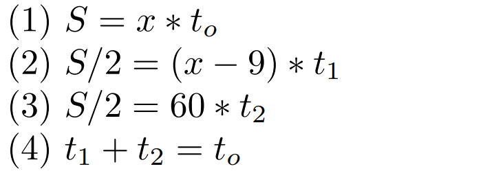 Дорогие Друзья, сегодня мы с вами разберем задачу из ОГЭ по математике на тему Движение. Из пункта А в пункт В одновременно выехали два автомобилиста. Первый проехал с постоянной скоростью весь путь. Второй проехал первую половину пути со скоростью, меньшей скорости первого автомобилиста на 9 км/ч, а вторую половину пути проехал со скоростью 60 км/ч, в результате чего прибыл в В одновременно с первым автомобилистом. Найдите скорость первого автомобилиста (больше 40 км/ч) Итак, начнем разбираться небольшими шагами, внимательно вчитываясь в условие задачи. Шаг 1 Из пункта А в пункт В одновременно выехали два автомобилиста. Первый проехал с постоянной скоростью (V = x км/ч) весь путь (S км). Второй проехал первую половину пути (S/2 км) со скоростью, меньшей скорости первого автомобилиста на 9 км/ч ( V_1 = (x-9) км/ч ), а вторую половину пути (S/2 км) проехал со скоростью (V_2 = 60 км/ч), в результате чего прибыл в В одновременно с первым автомобилистом (T_общ). Найдите скорость первого