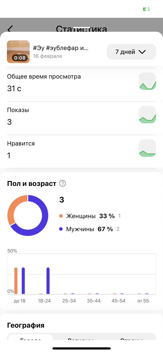 Все авторы Дзен могут пользоваться статистикой. Кто-то ей пользуется с компьютера, но мы знаем, что удобнее и доступнее нынче телефон. Использование статистики для автора самое важное, что может быть из невербального в Дзен. Мы постоянно проверяем количество показов, просмотров, лайков, комментариев, VTR и CTR. Только всё это бессмысленно, так как в статистике Дзен есть на столько гигантские проблемы, которые могут перечеркнуть все другие категории статистических данных. Сегодня мы рассмотрим только одну из нескольких ошибок. Вы никогда не интересовались, какие подписчики смотрят Ваши ролики, читают Ваши статьи или посты? Мужчины или женщины, какого они возраста? Предлагаю Вам вместе со мной посмотреть ролик 30-дневной давности. Я выбрал один из популярных роликов: В течение 7 последних дней ролик посмотрела одна девушка младше 18 лет, один мальчик до 18 лет и один до 24 лет. Данный канал состоит из веселых роликов о экзотических животных, потому такой результат вполне предсказуем. В