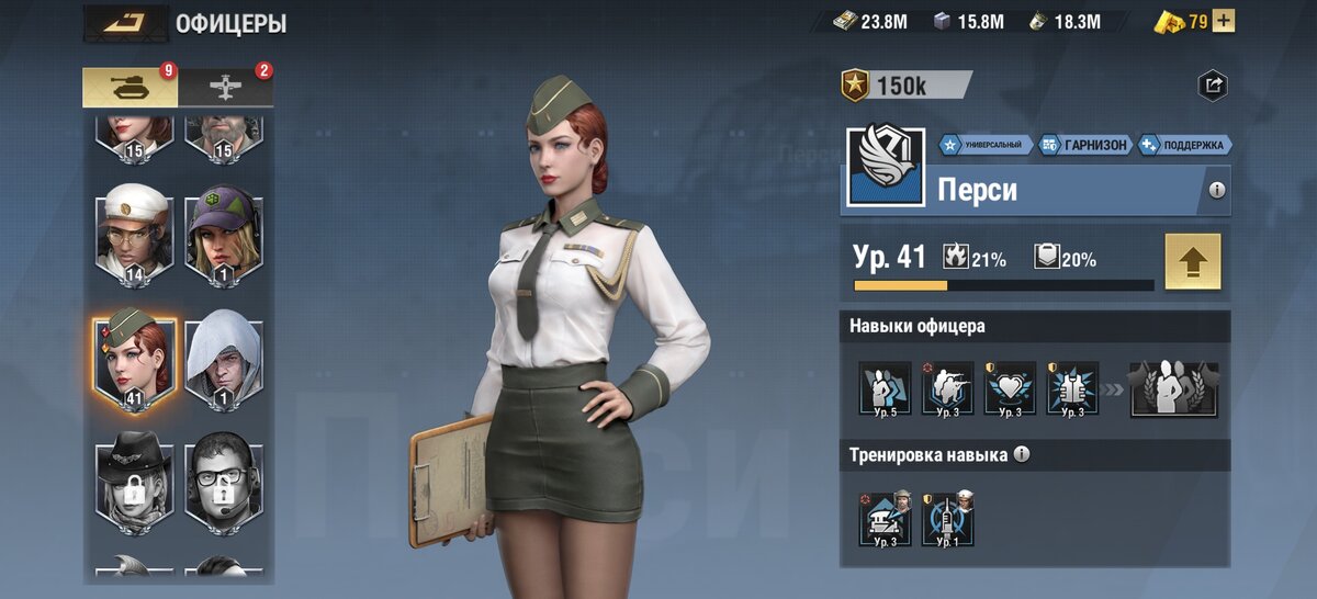 Начиная прокачивать офицеров новичкам рекомендую выбрать первым офцером, который будет прокачен до золота Перси Дело в том что её статуи можно получить за повышение уровня персонажа. Второго героя для прокачки ,я бы посоветовал выбрать Машина Войны. Стастуи этого героя вы можете купить в магазине альянса. Остальных героев следует выбирать уже исходя из ваших потребностей Например для артиллерии и Катюши Лудший выбор это Антонина Шевченко и Госпожа Свобода . Для танков я использую Сержанта Спанера и Стального Бойца.