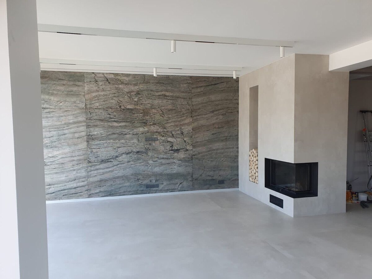 Хозяин этого дома часто действует по принципу: если хочешь сделать что-то хорошо, сделай это сам. Когда дизайнер показал визуализацию отделки каменным шпоном, клиент решил сам выбрать материал для отделки. Он лично приехал на склад Flat Stone, на месте определился с цветом и отсмотрел все 10 больших листов для проекта. Мы бережно упаковали и отправили каменный шпон. А монтаж осуществила бригада клиента, уже проводившая другие отделочные работы в доме.