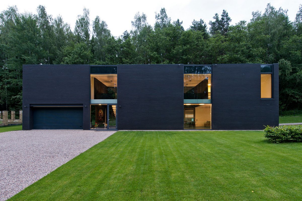 Этот семейный дом был разработан литовской студией Architectural Bureau G. Natkevicius & Partners в пригороде Минска в Беларуси. Черная монолитная конструкция выполнена из кирпича в стиле минимализма. Стены и потолок внутри дома представлены в белом исполнении, который за счет искусственного освещения приобретает живые, теплые оттенки в темное время суток. Прилегающая территория так же выдержана в стилистике минимализма, и кроме газона, гальки и деревянной тропинки там ничего нет. Вот что называется «избавиться от лишнего».