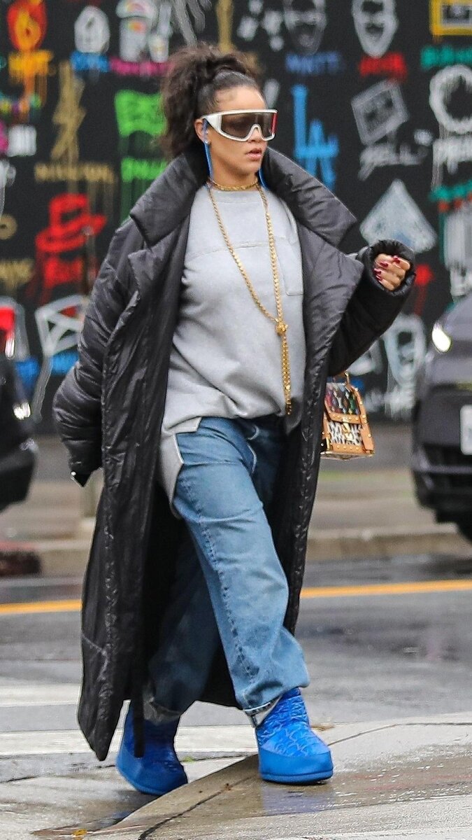Рианна отправилась на шопинг в ультрамодном образе. Звезда надела удлиненный свитшот с разрезами по бокам, широкие голубые джинсы и дополнила выход объемным пуховиком макси. Акцент певица сделала на деталях: массивных ботинках в синем оттенке, разноцветной сумке Louis Vuitton, крупной цепи и очках-маске.