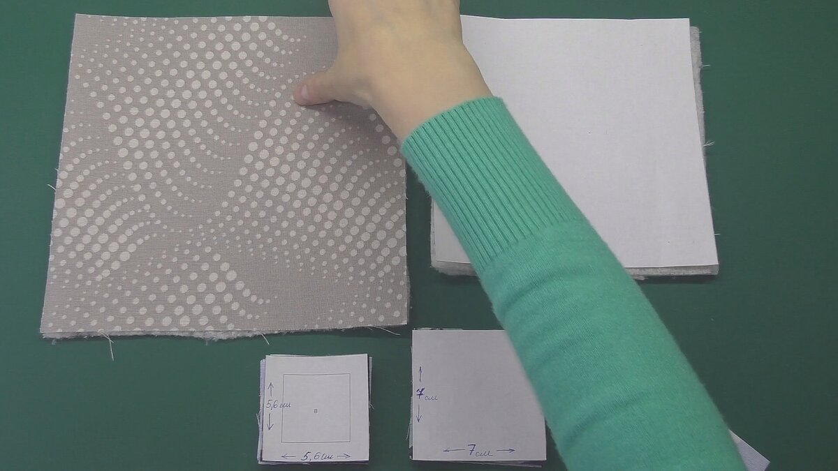 15 деталей 5,6х5,6 см. 2 детали из тёмной ткани и 13 деталей из светлой ткани. Обязательно контрастного цвета.