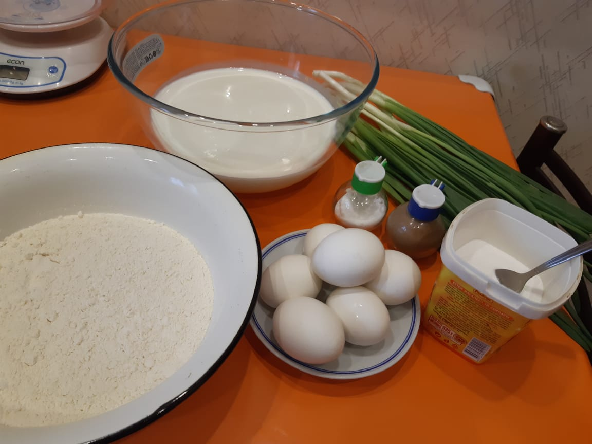 Тесто готово. Теперь я слегка присаливаю яйца с луком, перчу и добавляю их в тесто.