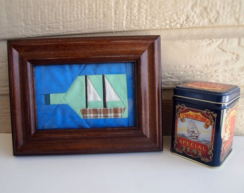 Когда-то моряки в плаваниях делали макеты своих кораблей, они же и помещали эти макеты в бутылки. Конечно, лоскутницы - не моряки, но сделать корабль в бутылке очень даже способны. Можно этот корабль и в рамочку поместить, и в качестве панно использовать. Да и в одеяло в морском стиле такая морская бутылка отлично впишется: Схема для шитья такой бутылки: А по этому сшитому блоку можно увидеть, как такой кораблик шьют: Но подробней хочу Вас познакомить с творчеством немецкого дизайнера по имени Надра, которая шьет лоскутные одеяла и преподает на курсах квилтинга. К сожалению, кроме имени и ее работ ничего сказать больше не могу. Так вот тот самый корабль в бутылке, который разработан Надрой: Начинается этот корабль так же, как и у моряков, с макета корабля: Как его шить - подробно объяснять не буду, мне кажется, что по фото всё видно. Размеры приводить не буду, так как процесс идет по фото на разлинованном коврике для резки и желающие смогут легко эти размеры подсчитать. Так вот, пос