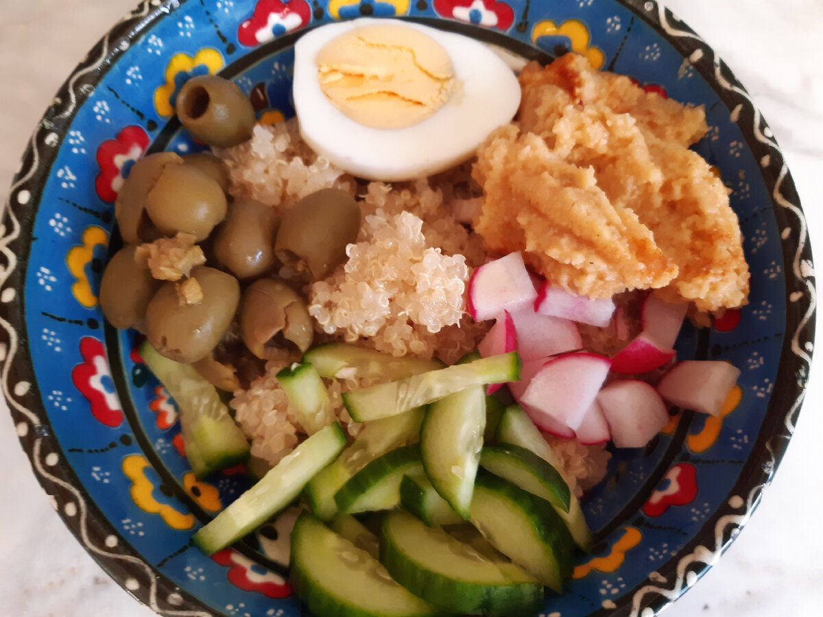 Уже третий месяц подряд мы питаемся на 178 руб в день. Это составляет 5500 руб в марте и январе, а в феврале -5000 руб. Про все свои запасы на 1 марта рассказывала ЗДЕСЬ. КАТАЛОГ РЕЦЕПТОВ - здесь все рецепты и полезные статьи по экономии, которые есть на канале Покупка продуктов №1 -Вкусвилл, Дикси Покупка продуктов №2 -Вкусвилл, Дикси, Перекресток, Верный Покупка продуктов №3 -Вкусвилл, Дикси, Перекресток Покупка продуктов №4 - Tasty Coffee, WB, Вкусвилл, Магнит, Дикси На завтрак приготовила киноа боул. Сегодня боул в средиземноморском стиле -киноа, редис, огурец, яйцо, хумус, оливки и оливковое масло из вяленых помидоров. Чашечка кофе, бутерброды на домашнем хлебе с пастромой из курицы, зефир кофейный С собой на работу снова, как и вчера, взяла творог с клубникой и грибной жюльен На ужин потушила в сметане печенку говяжью, на гарнир - киноа (оставалась с завтрака) и два салата - из тертой моркови с чесноком и квашеная капуста Также вечером испекла еще одну буханку хлеба и ленивый ха