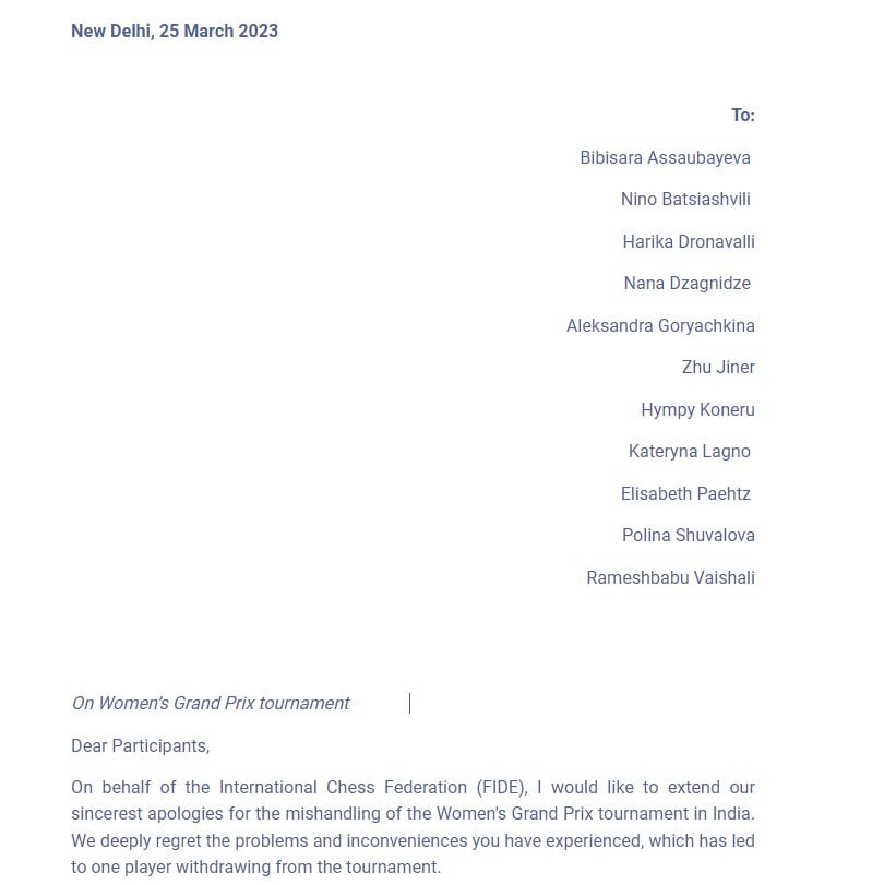 Перед всеми, кроме Жансаи Абдумалик. Имя покинувшей турнир из-за жуткой организации шахматистки президент ФИДЕ демонстративно не включил в список адресатов своего письма.