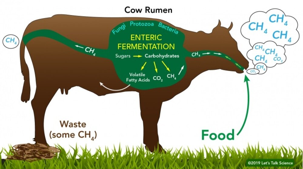 Теперь вот решили отказаться от мяса, потому что само по себе животноводство оказалось просто жуть как вредно. И основной причиной назван тот факт, что коровы испускают слишком много метана (пукают и отрыгивают, если по-русски). Ну, так устроено их пищеварение - четыре килограмма бактерий в желудке Бурёнки денно и нощно перерабатывают клетчатку, выделяя этот парниковый газ.