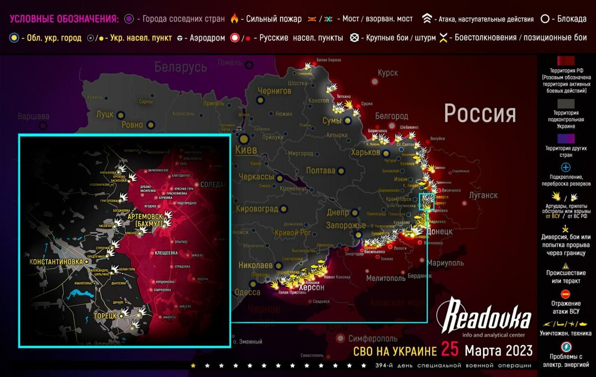 Актуальные данные за прошедшие сутки. Президент РФ Владимир Путин 26 марта заявил о том, что Россия разместит тактическое ядерное оружие в Белоруссии, не нарушая обязательств по ДСНВ. Это явный сигнал для прибалтийских стран, Польши и Украины, который способен удержать агрессивных соседей. Обстановка на фронтах за уходящие сутки Сватово-Кременное направление. Российская армия продвигается в районе Белогоровки. Также при поддержке артиллерии ВС РФ наступали в направлении Тернов, Невского и Макеевки. Артемовское (Бахмутское) направление. Бойцы ЧВК «Вагнер» продолжают наступать в направлении Богдановки и Орехово-Васильевки. В Артемовске, по данным ряда источников, продолжаются ожесточенные бои в районе Центрального рынка и вдоль Мариупольской и Садовой улиц. Кроме того, «оркестр» продвигается у Предтечино. На подступах к Красному продолжаются бои. Донецкое направление. ВС РФ наступают в районе Бердычей и Новобахмутовки, продолжая охватывать Авдеевку. Со стороны Песок продолжается штурм Первомайского. Также продолжаются бои за Марьинку.