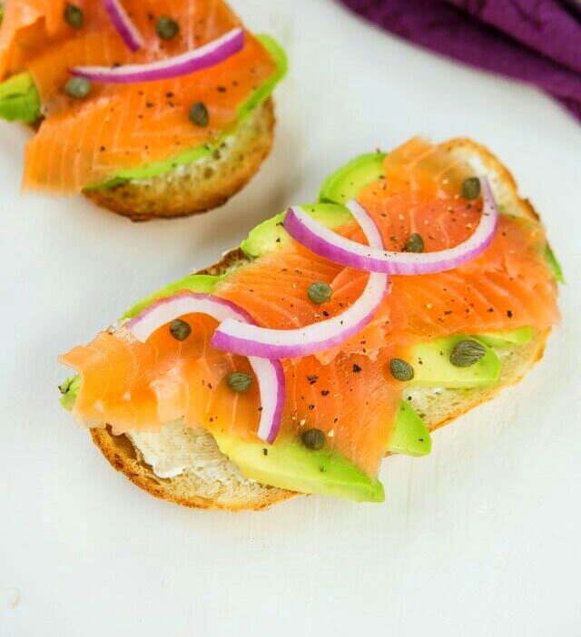 Ингредиенты: 2 тоста 50 г лосося 1/2 авокадо 1/4 красного лука 1 ст. ложка оливкового масла соль и перец по вкусу Инструкции: Обжарьте тосты на сухой сковороде. Нарежьте лосось, авокадо и красный лук. Разложите нарезанные ингредиенты на готовые тосты. Полейте оливковым маслом. Посыпьте солью и перцем по вкусу. Готово! Тосты с лососем и авокадо готовы за 5 минут. Приятного аппетита!