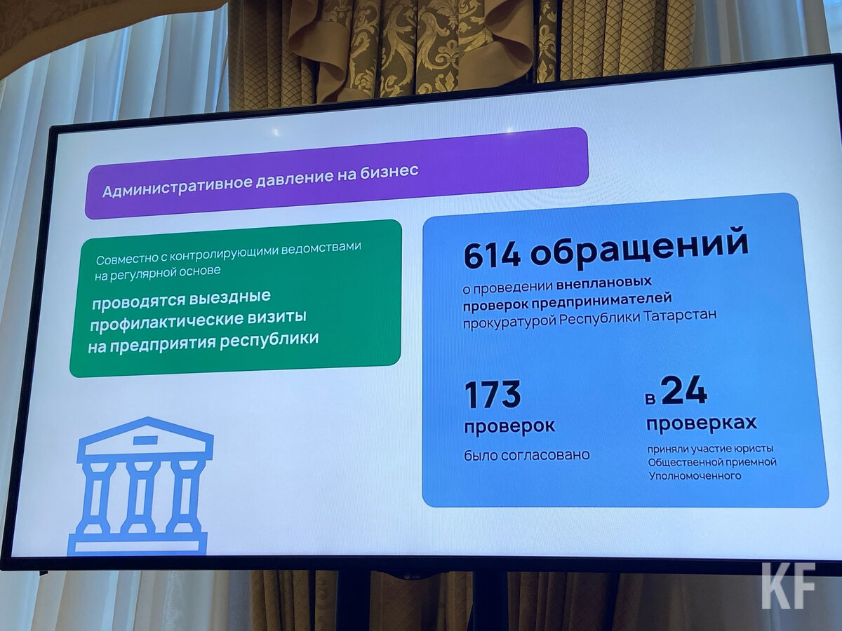 В 2022 году в качестве меры поддержки был наложен мораторий на проверки бизнеса. Из 614 обращений о проведении внеплановых проверок предпринимателей прокуратура Татарстана одобрила только 173 (28%). Об этом на заседании комитета Госсовета РТ по экономике, инвестициям и предпринимательству сообщил уполномоченный при раисе РТ по защите прав предпринимателей – помощник раиса республики Татарстан - У контрольно-надзорных органов остается возможность проведения внеплановых проверок, и в прошлые годы именно они, судя по поступающим к нам обращениям, доставляли предпринимателям особые сложности. Хочу поблагодарить прокуратуру республики Татарстан и лично за жесткую позицию в отношении ограничения «аппетита» контроллеров, - рассказал бизнес-омбудсмен. Он также сообщил, что по данным 2022 года в индексе административного давления республика поднялась с 60 на 4 место. Абдуганиев добавил, что контролирующие органы регулярно проводят профилактические визиты на предприятия, что помогает устранить н