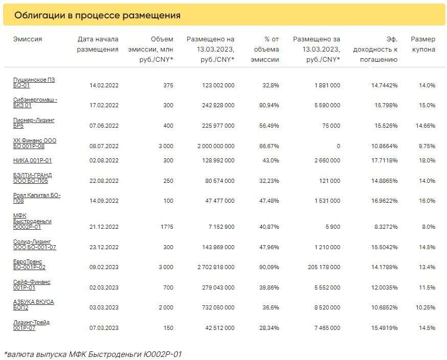 Коротко о торгах на первичном рынке 13 марта новых размещений не было. На первичном рынке ускорилось размещение выпуска «ЕвроТранс» БО-001Р-02 до более чем 200 млн рублей. Всего с 9 февраля было собрано 2,7 млрд рублей из 3 млрд запланированных. На этой неделе размещение будет завершено. Другой же выпуск с аналогичным рейтингом А- от АКРА, но ставкой купона 10,25% (а не 13,4% как у «ЕвроТранса») привлек всего 8,5 млн (на уровне Лизинг-Трейд 001P-07 с рейтингом BB+). Из 2 млрд рублей выпуск «Азбука Вкуса» БО-П02 собрал с начала марта 732 млн рублей. Вероятно, после завершения размещения «ЕвроТранс» БО-001Р-02 ускорится и «Азбука Вкуса», поскольку основной пул организаторов в выпусках один и тот же. Близок к завершению размещения выпуск «Сибэнергомаш-БКЗ» 01 — 242 млн рублей из 300 млн. Коротко о торгах на вторичном рынке Зато на вторичных торгах выпуск «Азбуки Вкуса» БО-П02 находится в лидерах по оборотам. Вот только покупатели на «вторичке» требуют дисконт 0,1–0,2%. Что же, плата