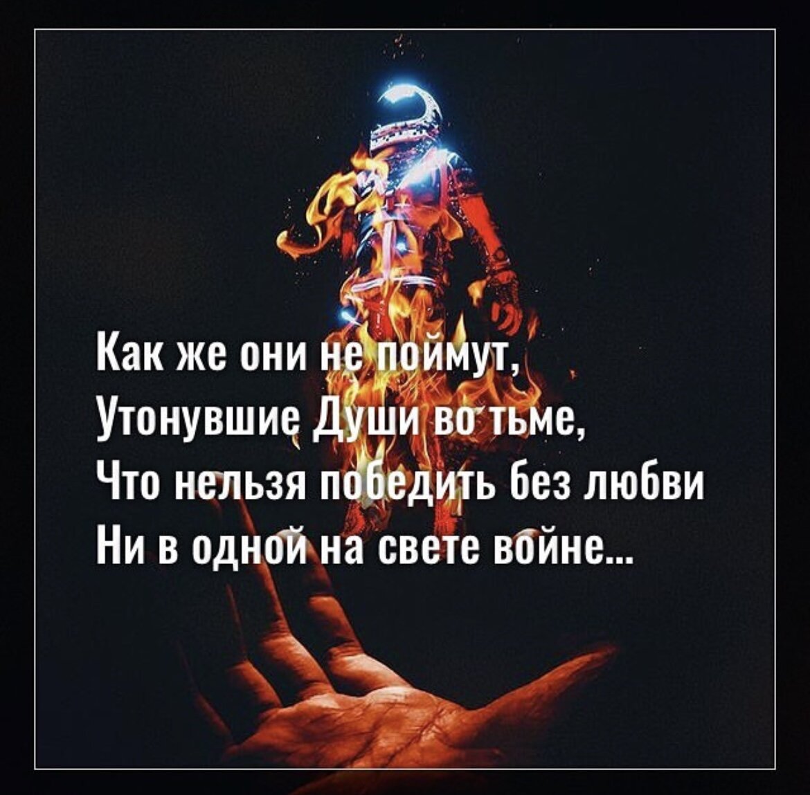 Как же они не поймут, Утонувшие Души во тьме, Что нельзя победить без любви Ни в одной на свете войне. Бумеранг запуская зла, Он вернётся мгновенно обратно, Только в бОльшем объёме И уже безвозвратно. Может быть стоит начать Свой воскрешать свет, Причины искать в себе? У них времени на это нет! Заняты лишь разрушением, Планами жесткой мести, Сами страдают от этого, Стоят на одном месте, Только глубже спускаясь, Туда, куда свет не прольётся, Ненависть - чувство опасное, Душа с ней наверх не вернётся…