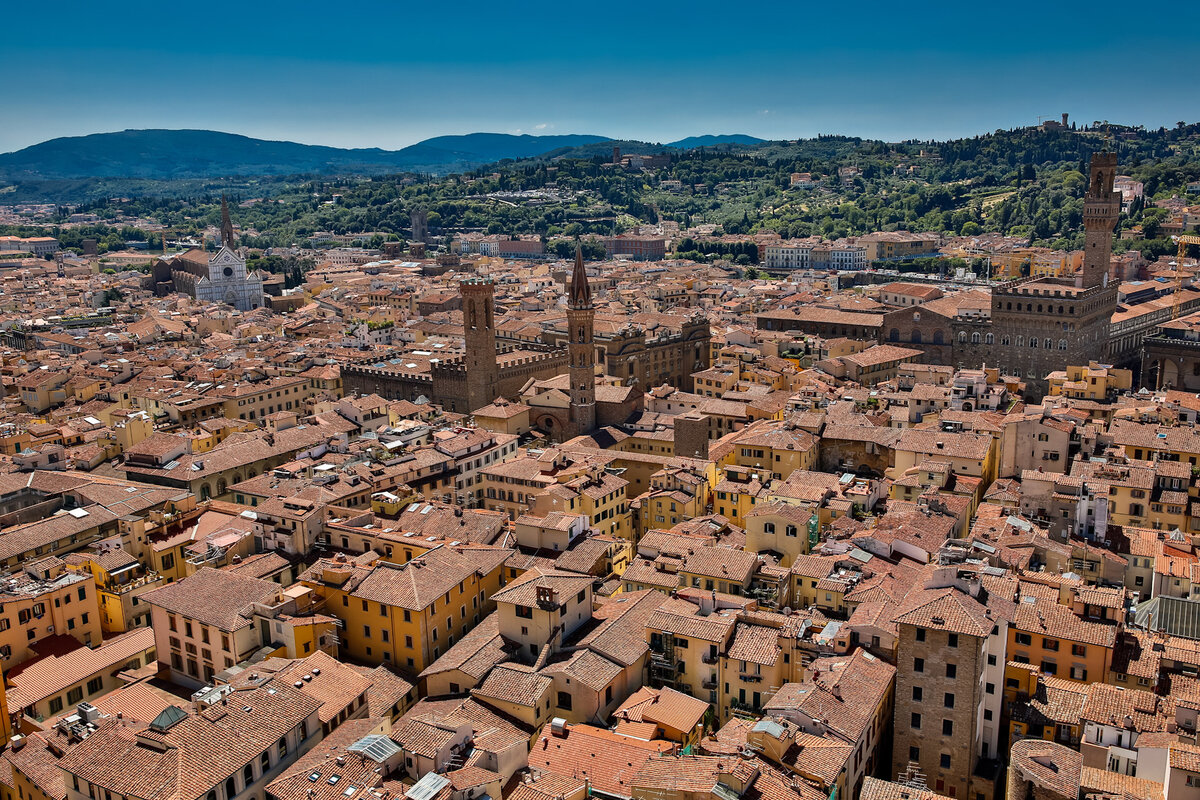 Забавно еще и то, что я не обратил с земли примерное количество площадок в колокольне, поэтому поднявшись на вторую, я разочаровано решил, что все — это уже самый верх и проклиная организаторов начал снимать виды Флоренции сквозь довольно частую решетку. Однако, вскоре обнаружил неприметный ход выше. Площадкой выше повторилась эта же ситуация, пока наконец я не оказался на крыше колокольни, откуда Флоренция раскинулась черепичными крышами под полуденным солнцем.