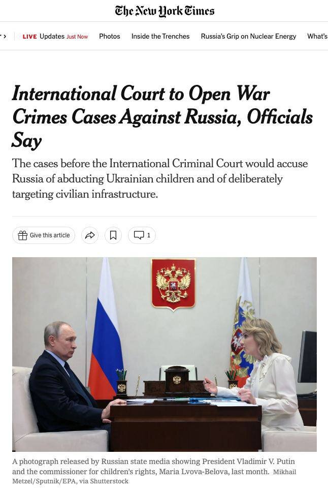 Международный суд возбудит дело против России дело о военных преступлениях — New York Times со ссылкой на источники, осведомленные о подготовке решения. По данным газеты, Россию обвинят в похищении украинских детей и в преднамеренном нанесении ударов по гражданской инфраструктуре.