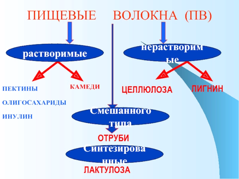 которые участвуют в формировании объема съеденной пищи, необходимы для нормального функционирования печени, желчного пузыря, кишечника, для предупреждения запоров. В пищеварительном тракте они захватывают и выводят естественным способом шлаки, токсины и другие вредные вещества, накапливающиеся внутри ЖКТ. В свою очередь пищевые волокна подразделяются на: растворимые, нерастворимые и смешанного типа. РАСТВОРИМЫЕ ПИЩЕВЫЕ ВОЛОКНА Растворимые пищевые волокна - пектины, инулин, камеди и др. Растворимые пищевые волокна в основном содержатся в мякоти растений, придавая плодам эластичность и упругость