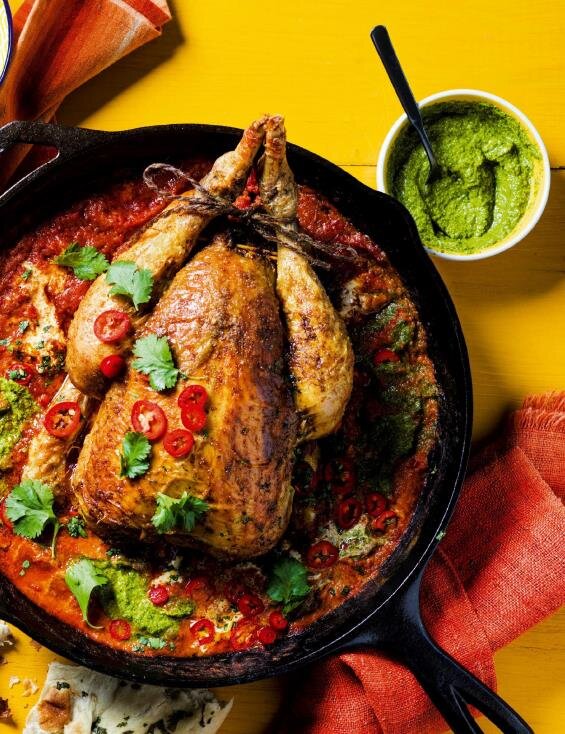 Классическая жаренная курица – вкусная, но можно поэкспериментировать. Этот рецепт курицы прост и необычен. Курица фаршируется прянным маслом и готовится до хрустящей корочки, затем поливается сливочным соусом и подается с пикантным зеленым соусом. Нам понадобится курица среднего размера ( 1,6 кг.); Для смеси специй 1 ч. ложка молотого тмина; 1 ч. ложка молотого кориандра; 1 ч. ложка копченной паприки; 1 ч. ложка молотой куркумы Для соуса 4 больших зубчика чеснока; 1 нарезанная луковица; 1-2 нарезанных красных перца чили (добавляйте по остроте); 1 большой кусок размером с большой палец имбирь, очищенный и нарезанный; 1 ст. ложка растительного масла; 2 ст. ложки сливочного масла; 700 гр. помидоров в собственном соку (измельчить в кухонном комбайне); 2 ч. ложки сахара; 3-4 ст. ложки жирных сливок; соль по вкусу Для зеленного соуса 30 гр. кешью (можно взять другие орехи); пучок петрушки; 1 веточка мяты; сок лимона; 70 мл. оливкового масла; соль по вкусу Разогрейте духовку до 200 градусов.