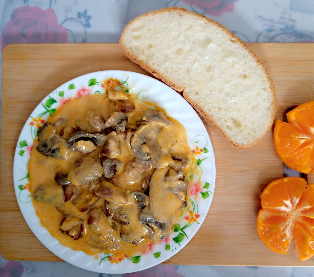 - 200 грамм шампиньонов у нас замороженные , нарезанные и обжаренные.