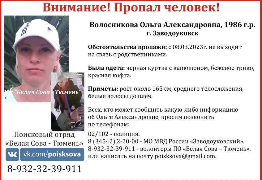 Не выходит на связь: в Тюменской области 8 марта пропала 36-летняя женщина! В городе Заводоуковске Тюменской области пропала Ольга Волосникова 1986 года рождения. Женщина пропала 8 марта и не выходит на связь с родственниками. Об этом сообщили волонтеры поискового отряда «Белая Сова-Тюмень».