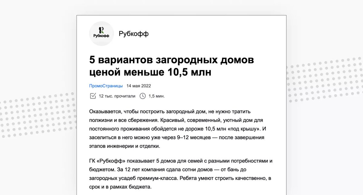 Задача. С помощью Яндекс ПромоСтраниц рассказать о технологиях строительства и материалах «Рубкофф» — объяснить покупателям, из чего складывается цена, и сравнить ее с предложениями конкурентов. Получить лиды, которые идут по воронке лучше, чем заявки с Директа.