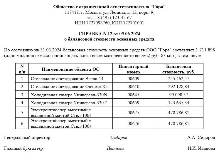 Справка о балансовой стоимости основных средств (ОС) — это документ, дающий представление о стоимости данных активов организации на определенную дату. Она может использоваться: