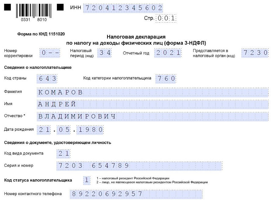 Скачать заполненный образец 3-НДФЛ за 2021 год