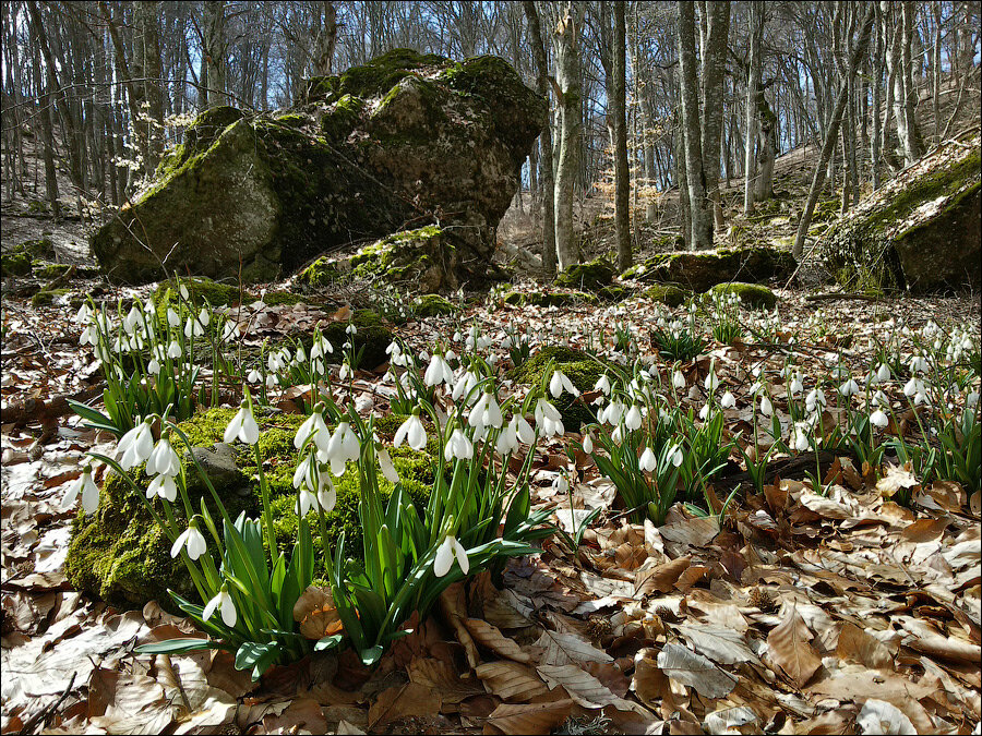 15 марта этот лес встретил нас солнышком. Мы прошлись по прекрасной дорожке к памятнику строителям дороги, а идти дальше решили вправо — дорогой, ведущей к Андрюхиной поляне. Несколько лет назад мы случайно свернули на неё туманным январским утром, и дорога эта подарила нам море красоты. И на сей раз она не подвела — порадовала подсненижниковыми полянками.