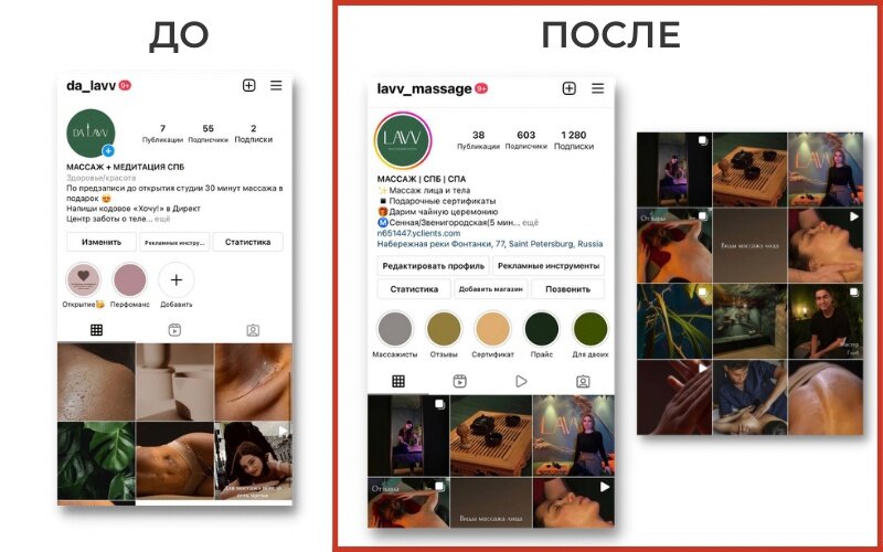 Активное продвижение страницы и наша совместная работа со специалистами студии массажа привели к тому, что аккаунт lavv_massage стал появляться первым в поиске при вводе интересующего запроса, это значит, что в аккаунте была постоянная активность от аудитории и высокая вовлеченность. И, что самое главное, все действия привели к активной записи клиентов на массаж в студию.